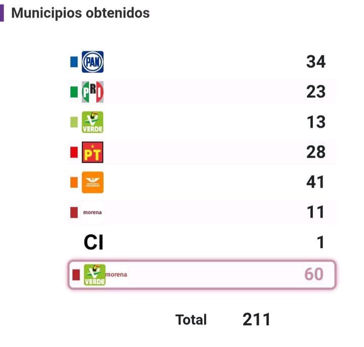 La expectativa de un triunfo arrollador quedó muy lejos de cumplirse. Desde el cierre de las casillas, las dirigencias estatal y nacional de MORENA celebraron anticipadamente una supuesta victoria de más de 150 municipios. Sin embargo, con más del 97% del PREP computado, Morena y su único aliado formal —el Partido Verde— apenas lograron 84 alcaldías.