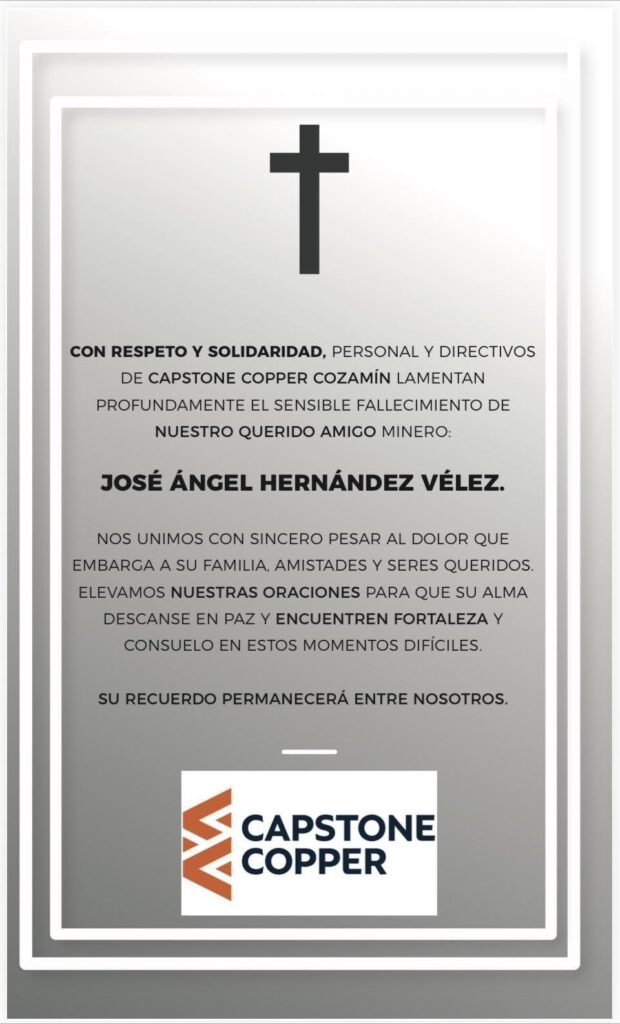 La empresa Capstone Copper, en donde laboraba José Ángel antes de viajar a Sinaloa, publicó una esquela para expresar sus condolencias y apoyo a la familia, confirmando su deceso.