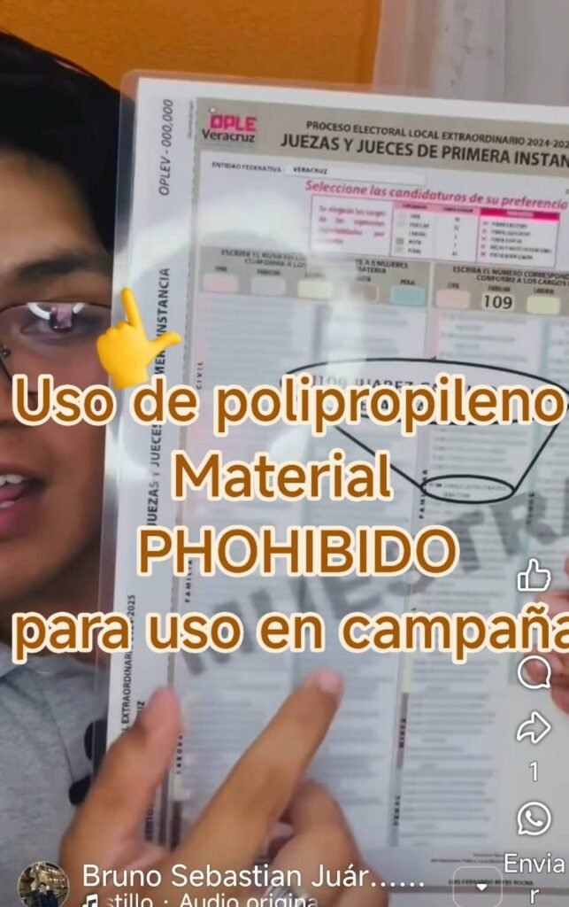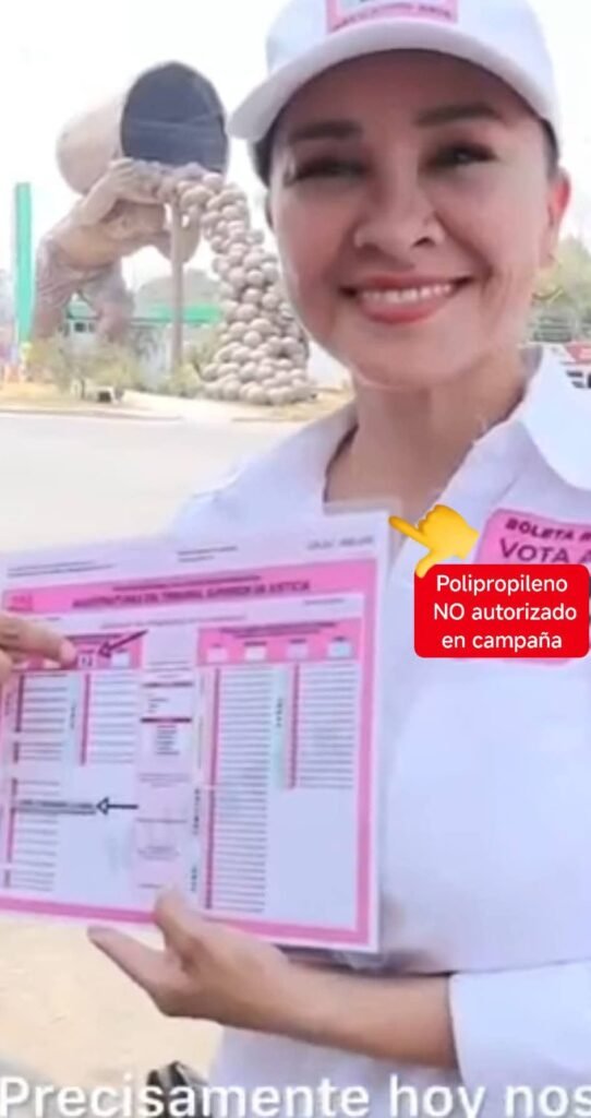 Algo similar es el caso de Liliana López Coronado, aspirante a magistrada en materia familiar, esposa del diputado federal y exsecretario de Educación Zenyanzen Escobar, quien utilizó una réplica ampliada de la boleta electoral recubierta de polipropileno. Este material es un plástico derivado del petróleo que tarda cientos y hasta miles de años en biodegradarse.