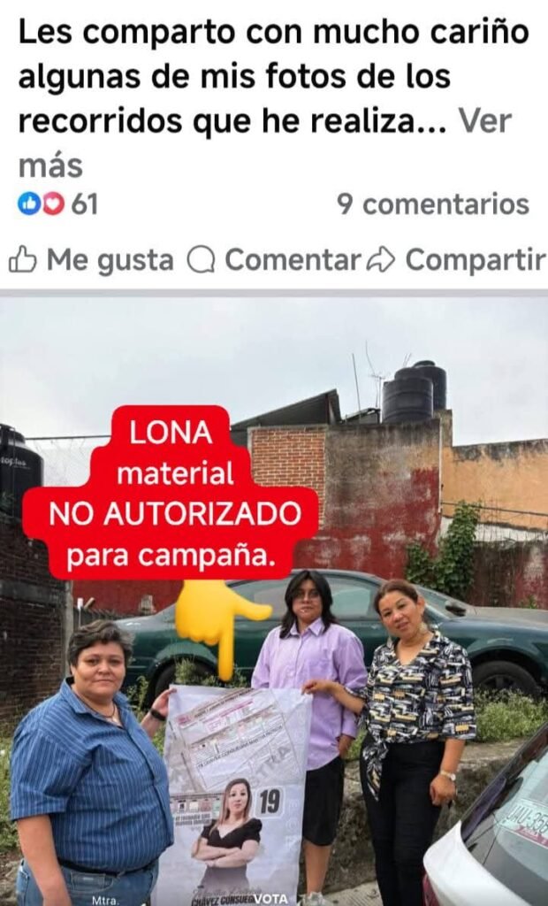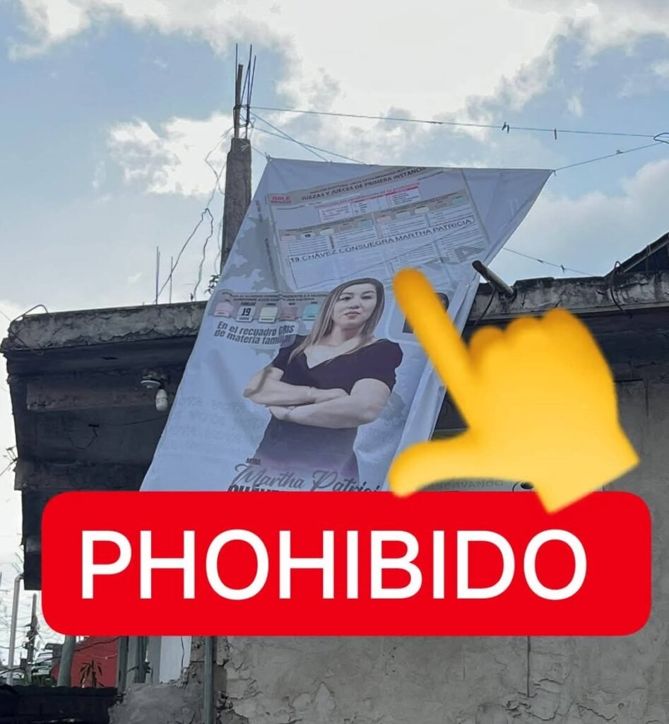 La candidata Martha Patricia Chávez Consuegra, aspirante a Jueza de Primera Instancia en Materia Familiar, también utilizó lonas para difundir su imagen, lo que se puede constatar en sus redes sociales, donde posa con el material que el INE y el OPLE prohibieron para uso en campaña. Aunado a lo anterior, instaló lonas promocionales en la zona donde se ubica su domicilio.