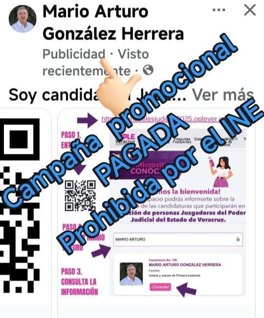 En redes sociales circula una publicación marcada por la empresa Meta como “Publicidad”; en ella, Mario Arturo González Herrera, candidato a juez de primera instancia en materia familiar, promueve la consulta del micrositio “Conóceles” para que sea revisado su perfil como candidato. Este aspirante se desempeñó como asesor de la secretaría de gobierno durante la administración de Cuitláhuac García y, a pesar de conocer la ley, ignoró que los lineamientos del INE para campaña prohíben contratar publicidad.