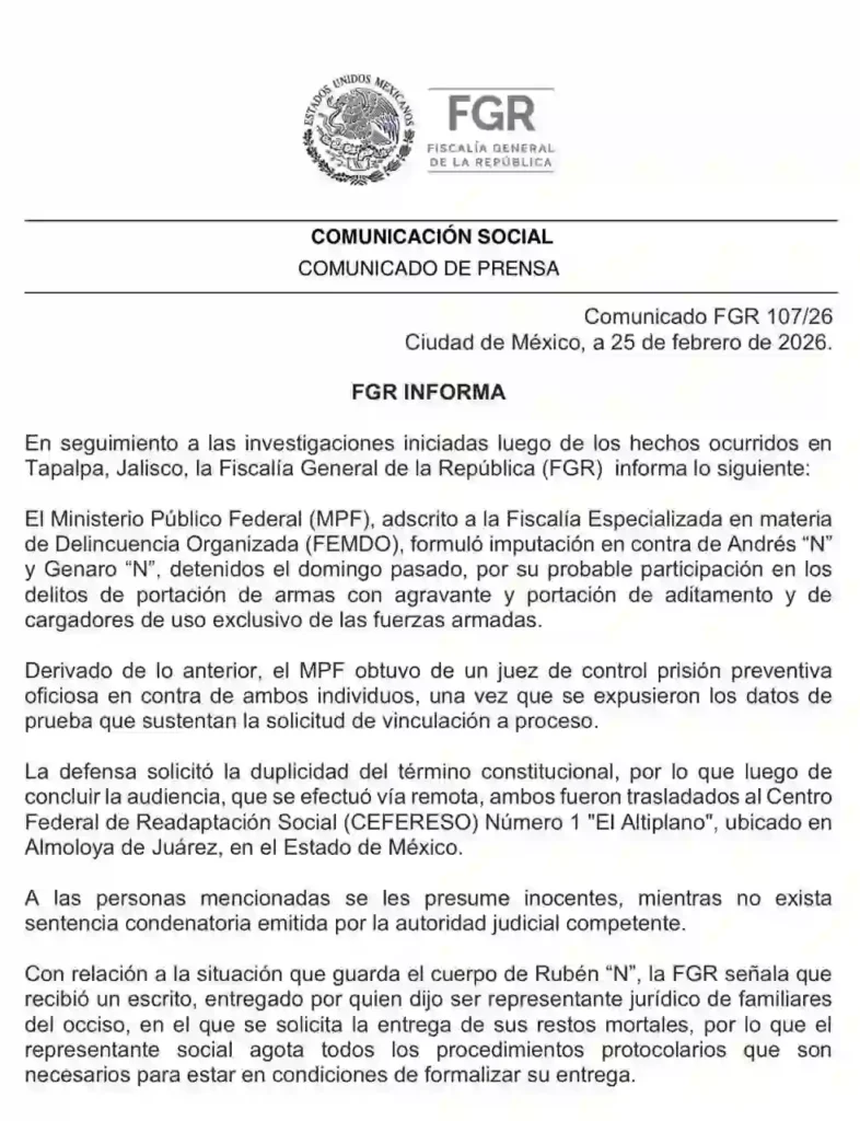 De acuerdo con el comunicado oficial FGR 107/26, emitido el 25 de febrero de 2026, fueron imputados por su probable participación en: